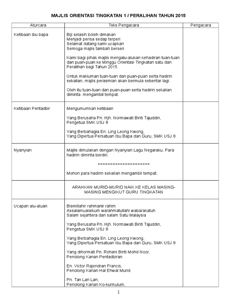Teks Pengacaraan Ceramah Bomba Dan Penyelamat Sk Sebobok. Ucapan pengarah Tak molek jika ada alu tiada lesungnya Tak berguna jika ada dayung tiada perahunya Tak berkat ilmu tanpa amalnya Tak lengkaplah majlis jika tidak ada yang merasmikannya Sidang hadirin sekalian Untuk menyempurnakan majlis pada hari ini dipersilakan Puan Tumerah Binti Rosmin Pengarah IPGK PM bagi menyampaikan ucapan seterusnya menutup rasmi Majlis. Teks Ucapan Pengacara Majlis Pendaftaran Tingkatan 1 Docx.