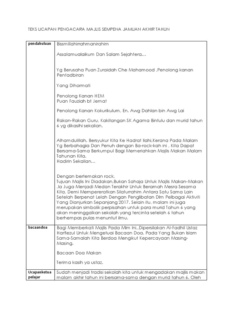 92078185 Contoh Teks Ucapan Pengacara Majlis Sempena Jamuan Akhir Tahun Baru Doc. Majlis dengan ini menjemput dan mempersilakan Pn Che Norizam Binti Abdullah untuk menyampaikan ucapan dan seterusnya merasmikan Majlis Jamuan Tahun 6. Mhd Ramli bin Che Mat Pengetua SMKPNZ.