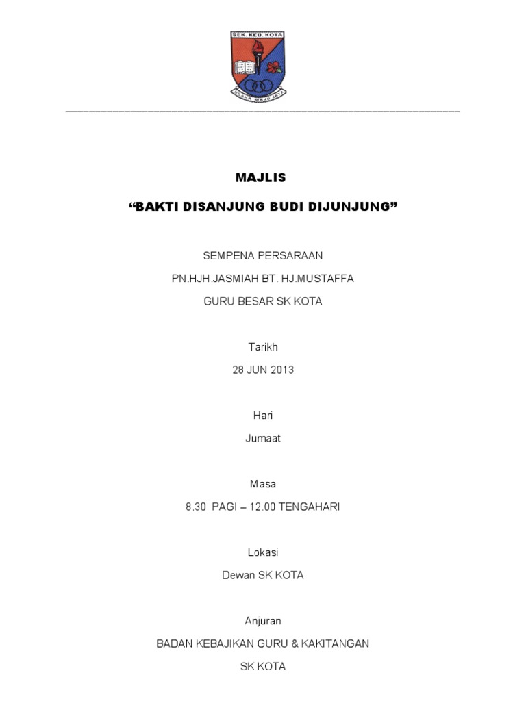Contoh kertas kerja majlis persaraan guru besar contoh kertas kerja majlis anugerah cemerlang contoh kertas kerja majlis khatam al quran contoh kertas kerja majlis perpisahan tahun 6 contoh kertas kerja majlis perkahwinan contoh kertas kerja majlis graduasi contoh kertas kerja majlis reunion contoh kertas kerja perniagaan contoh kertas kerja projek contoh kertas kerja lawatan. Ucapan GPK1 Puan Hamidah bt A Rahman Pengerusi BKGK Ustaz Sobri bin Ishak dan ucapan ketua pengawas adik Muhamad. SMK Cheras akan mengadakan majlis persaraan Penolong Kanan Tadbir Dan Kurikulum pada 16 Ogos 2016.