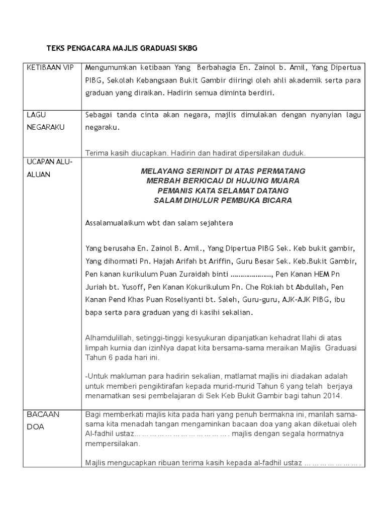 Teks Ucapan Perasmian Majlis Graduasi Tahun 6 Akhir sekali dalam bab 5 dimuatkan 16 contoh teks ucapan yang berfokus kepada teks ucapan alu aluan teks ucapan perasmian pelbagai majlis dan teks ucapan perpisahan untuk bacaan dan rujukan anda. Teks Pengacara Majlis Graduasi dan Jamuan Akhir tahun Pelajar Pendidikan Khas Intergrasi SMK Kampong Jawa. Teks pengacara majlis graduasi 2015.