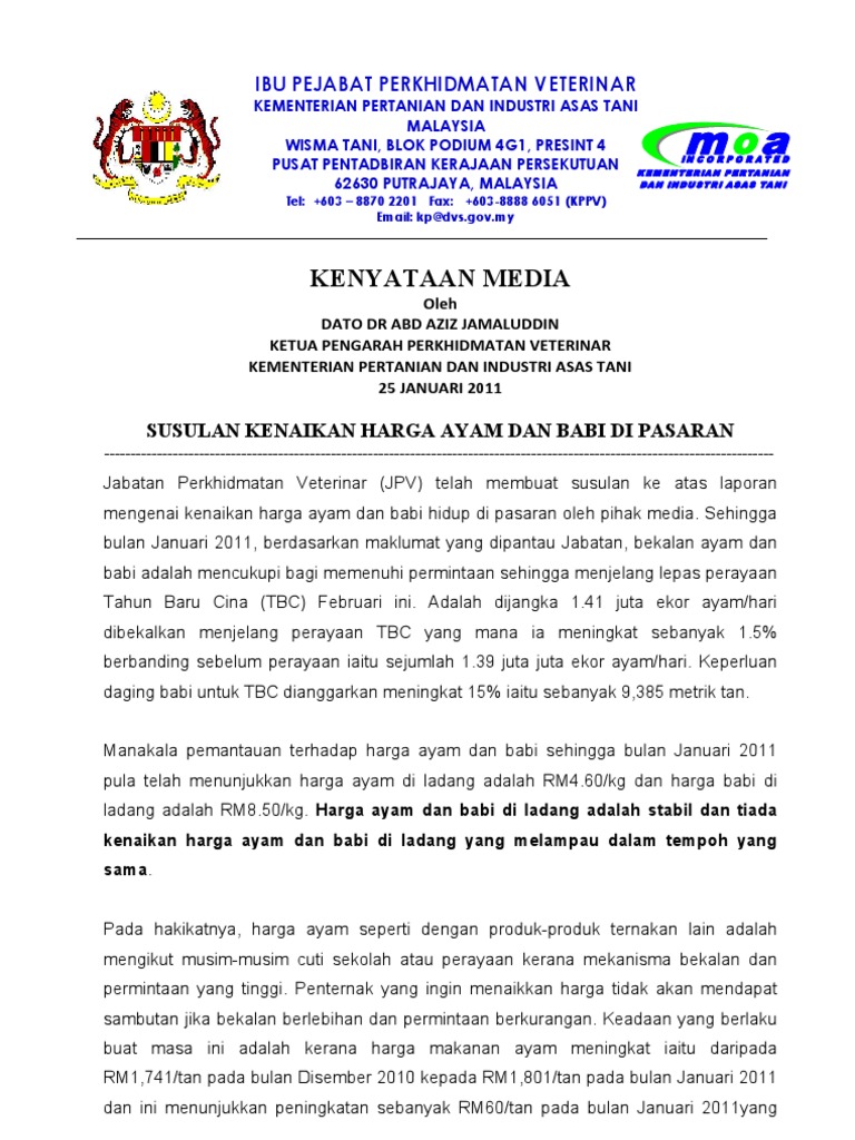 Kenyataan Media Susulan Kenaikan Harga Ayam Dan Babi Di Pasaran