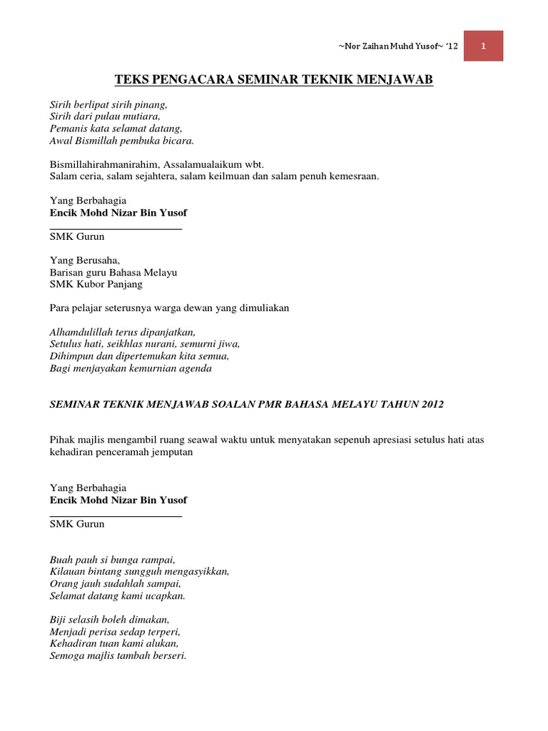 Rinda Cellu Share to. Teks Pengacara Majlis Seminar Teknik Menjawab Soalan.